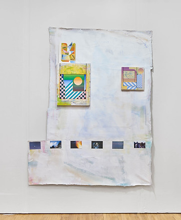 Acrylic paintings, colored pencil drawing and disposable photographs on collaged found canvas and paper substrate, 76"x65", 2023